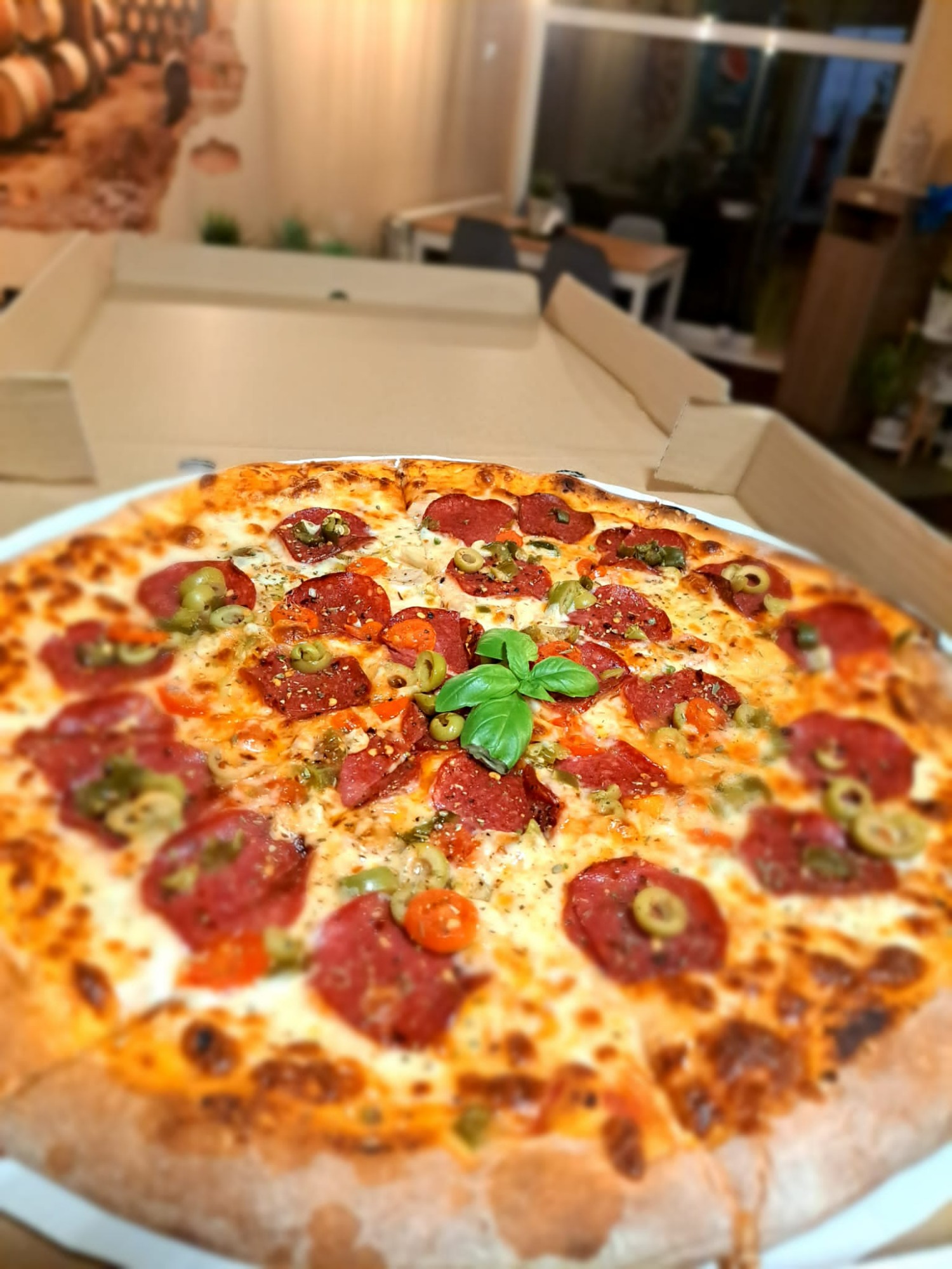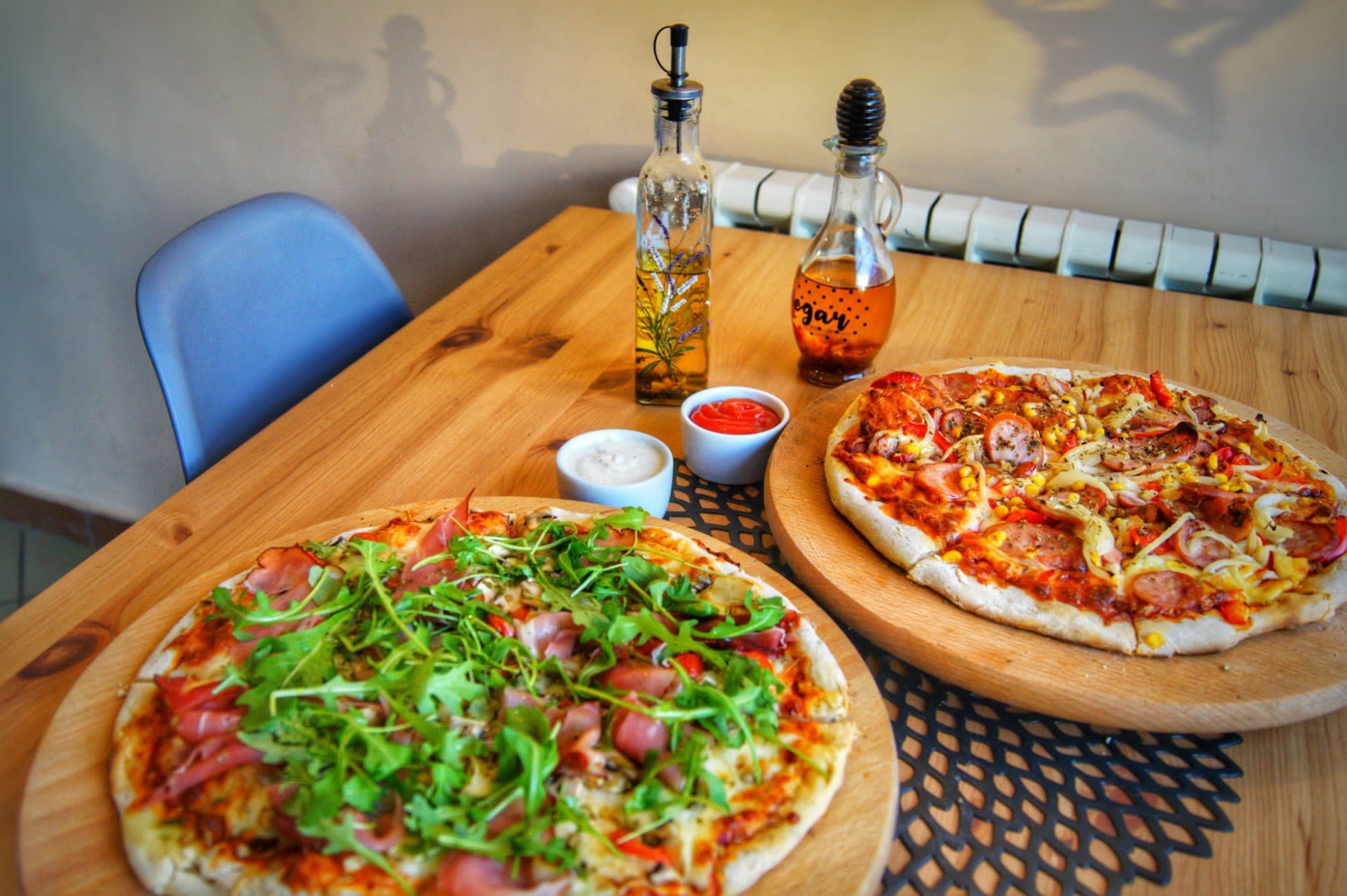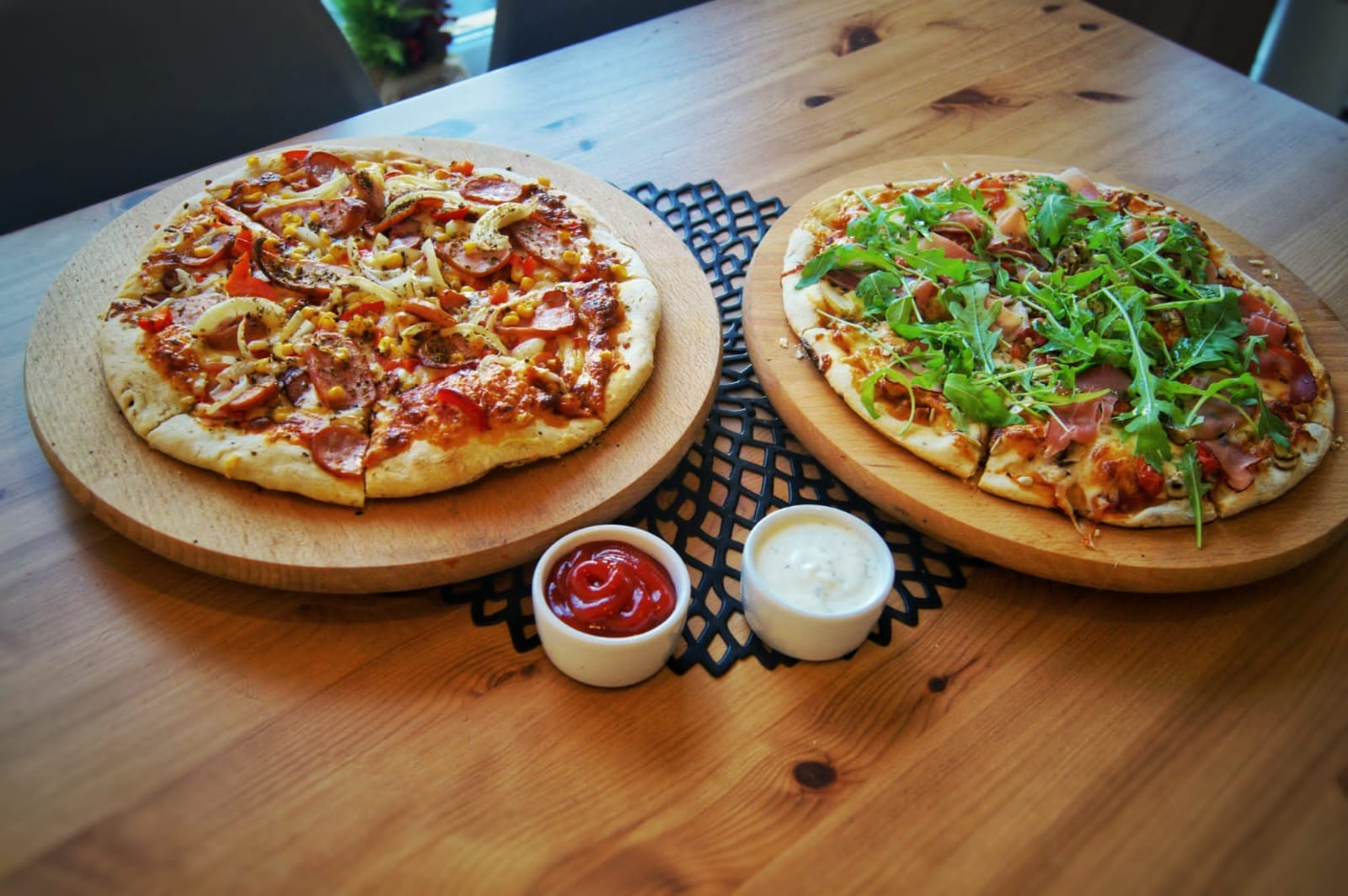 sos pomidorowy, ser, pomidory suszone, pieczarki, szczypiorek, oregano, rukola / roszponka21. Kozacka