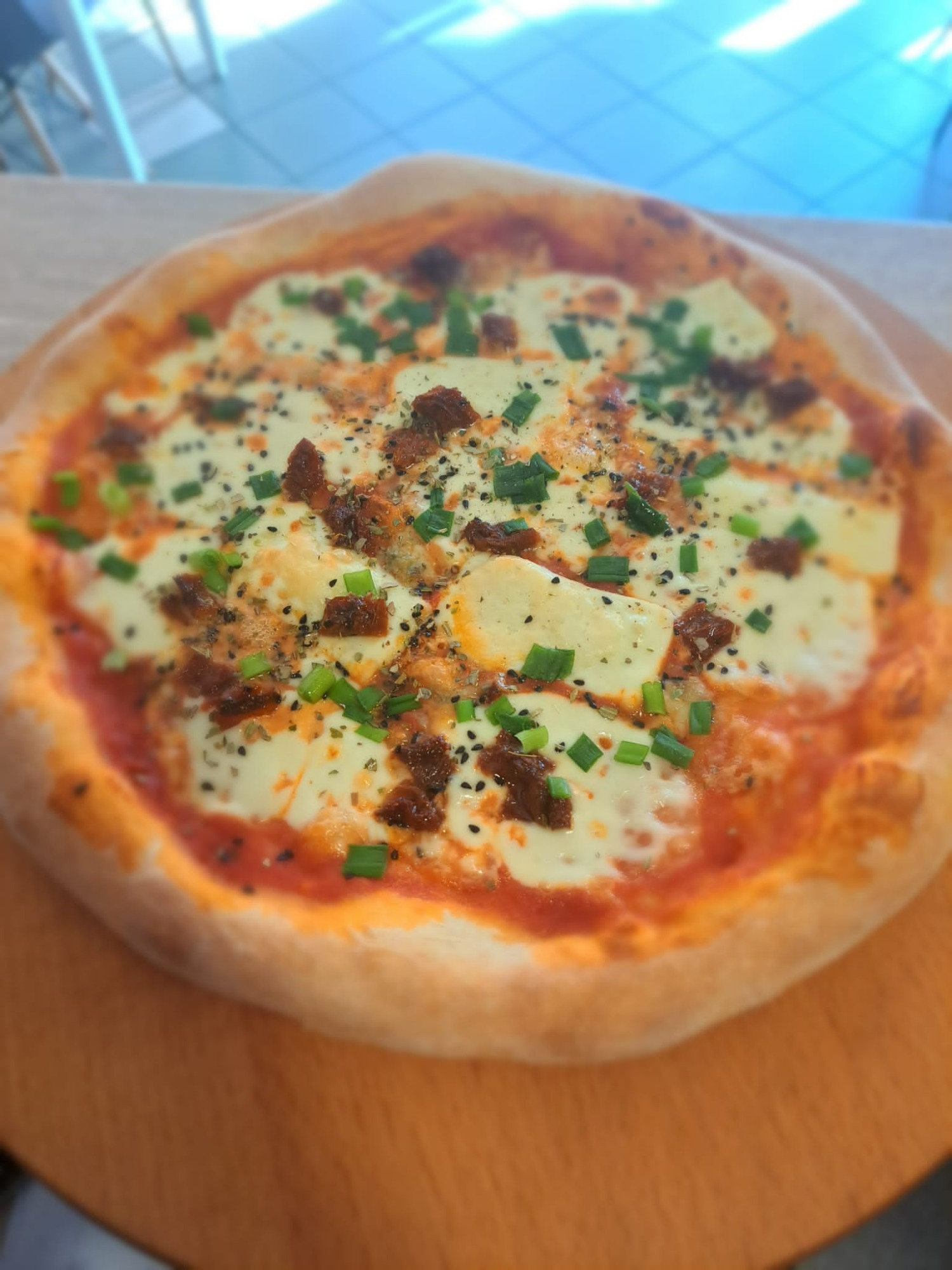 sos pomidorowy, ser gouda, ser mozzarella , halloumi, ser gorgonzola, pomidory suszone, szczypiorek, czarnuszka, oregano