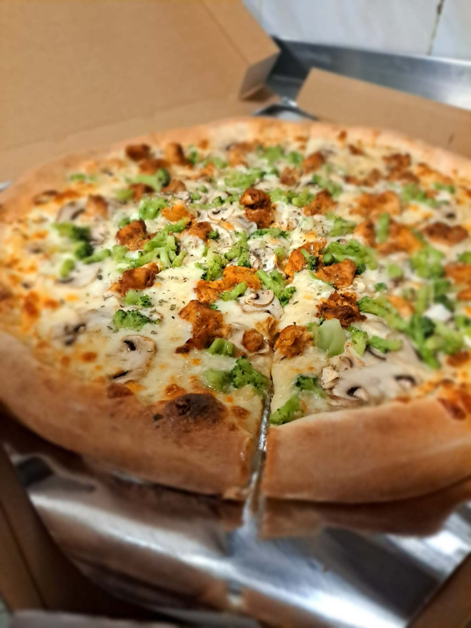 Sos śmietanowy, ser, boczek, brokuł, czerwona cebulka, oregano, ser feta.24. Bianca