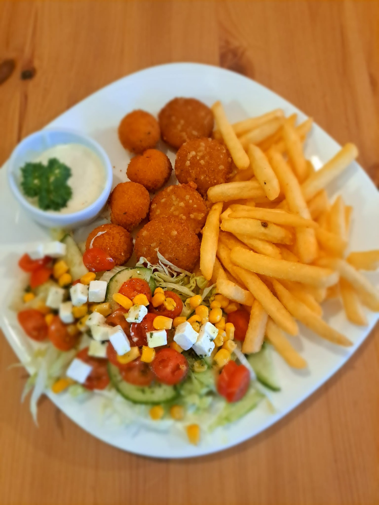 Świeże warzywa, nuggetsy serowe, sos